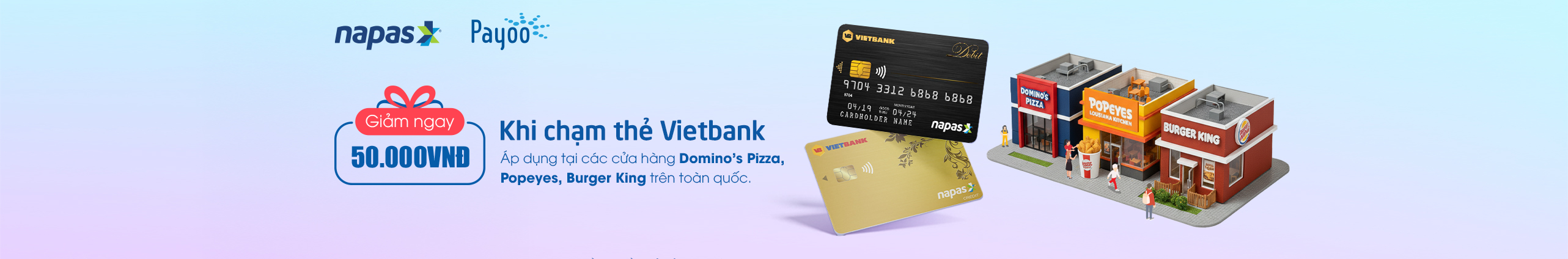 Giảm ngay 50.000 VND cho đơn từ 300.000 VND khi thanh toán bằng thẻ NAPAS tại các cửa hàng Domino’s Pizza, Popeyes, Burger King trên toàn quốc.