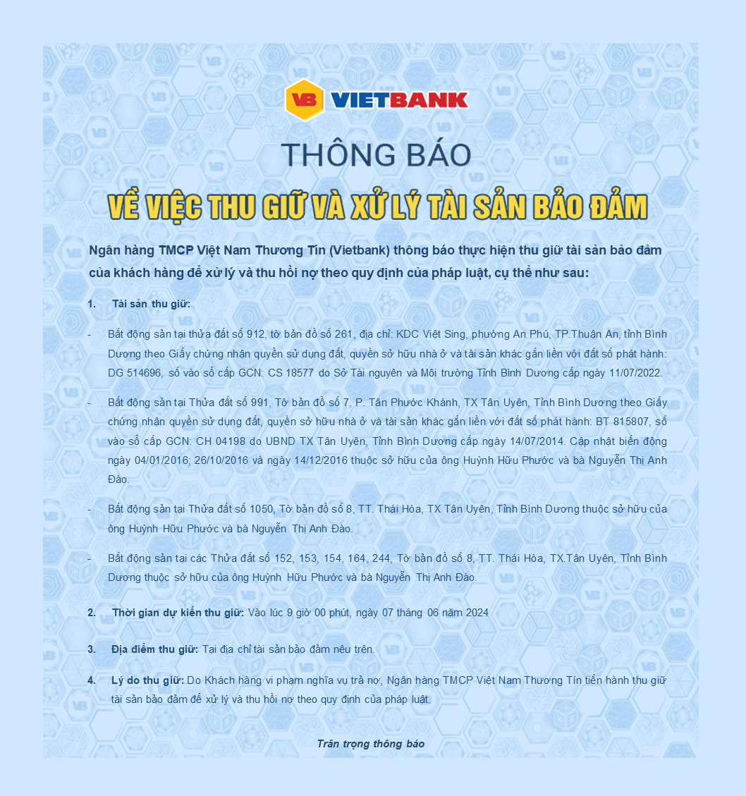 THÔNG BÁO V/V THU GIỮ VÀ XỬ LÝ TÀI SẢN BẢO ĐẢM