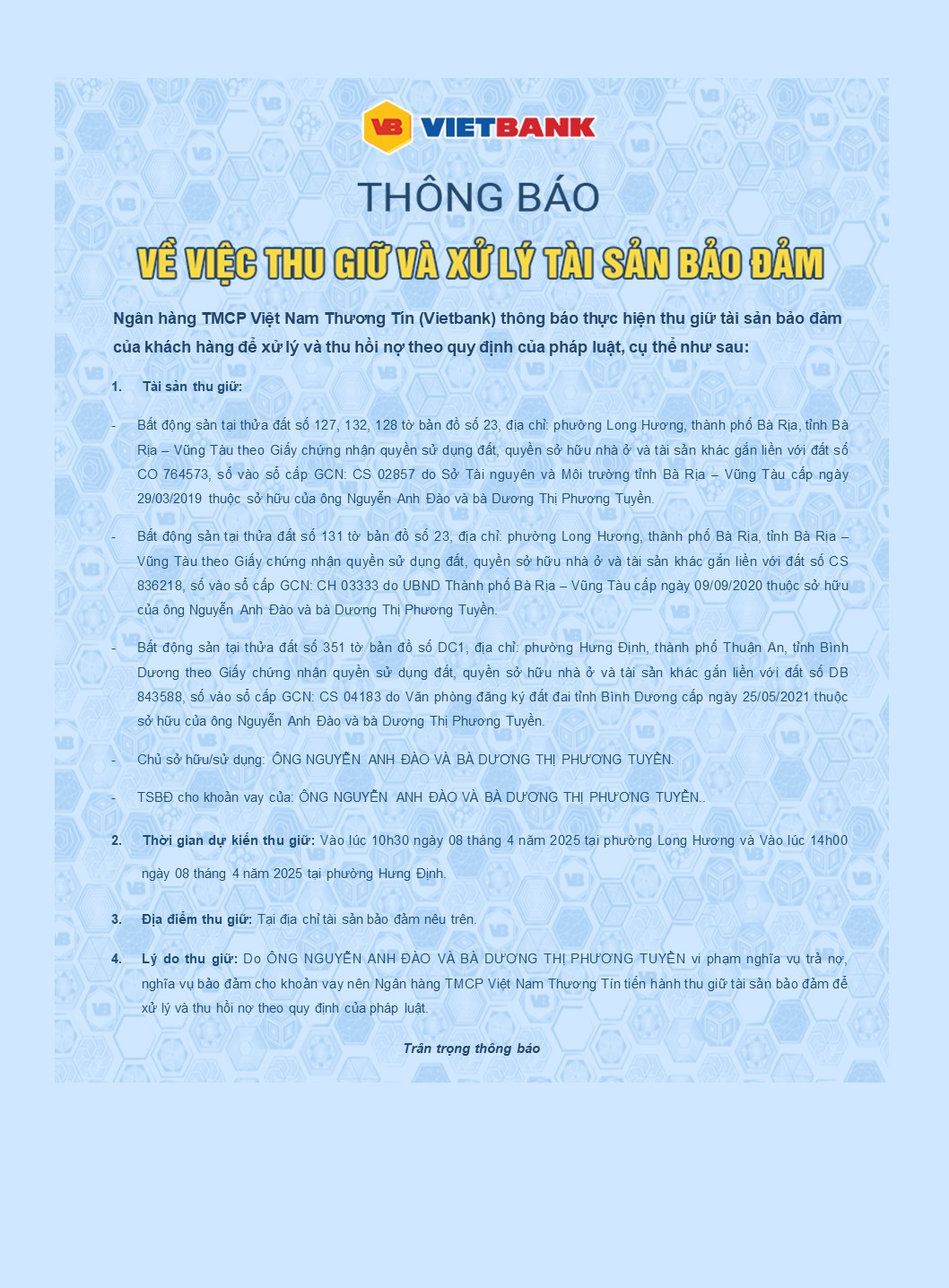 THÔNG BÁO V/V THU GIỮ VÀ XỬ LÝ TÀI SẢN BẢO ĐẢM