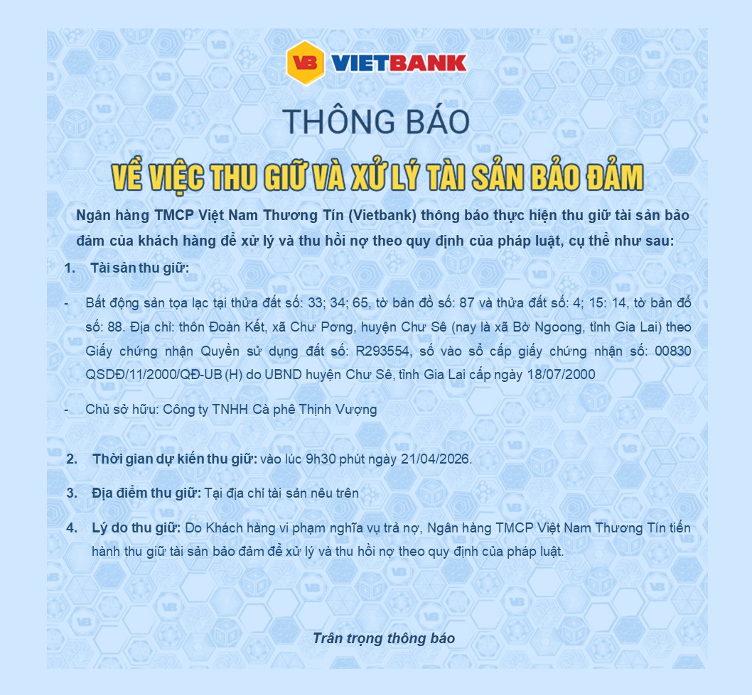 THÔNG BÁO V/V THU GIỮ VÀ XỬ LÝ TÀI SẢN BẢO ĐẢM