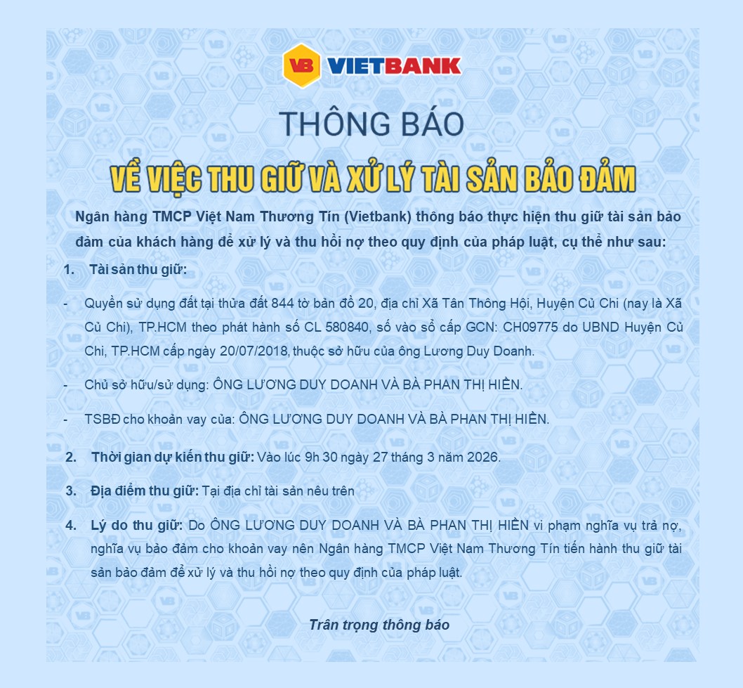 THÔNG BÁO V/V THU GIỮ VÀ XỬ LÝ TÀI SẢN BẢO ĐẢM