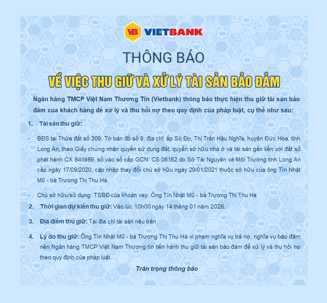 THÔNG BÁO V/V THU GIỮ VÀ XỬ LÝ TÀI SẢN BẢO ĐẢM