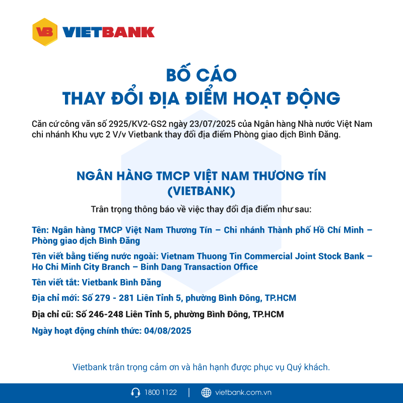 BỐ CÁO THAY ĐỔI ĐỊA ĐIỂM VIETBANK PGD BÌNH ĐĂNG